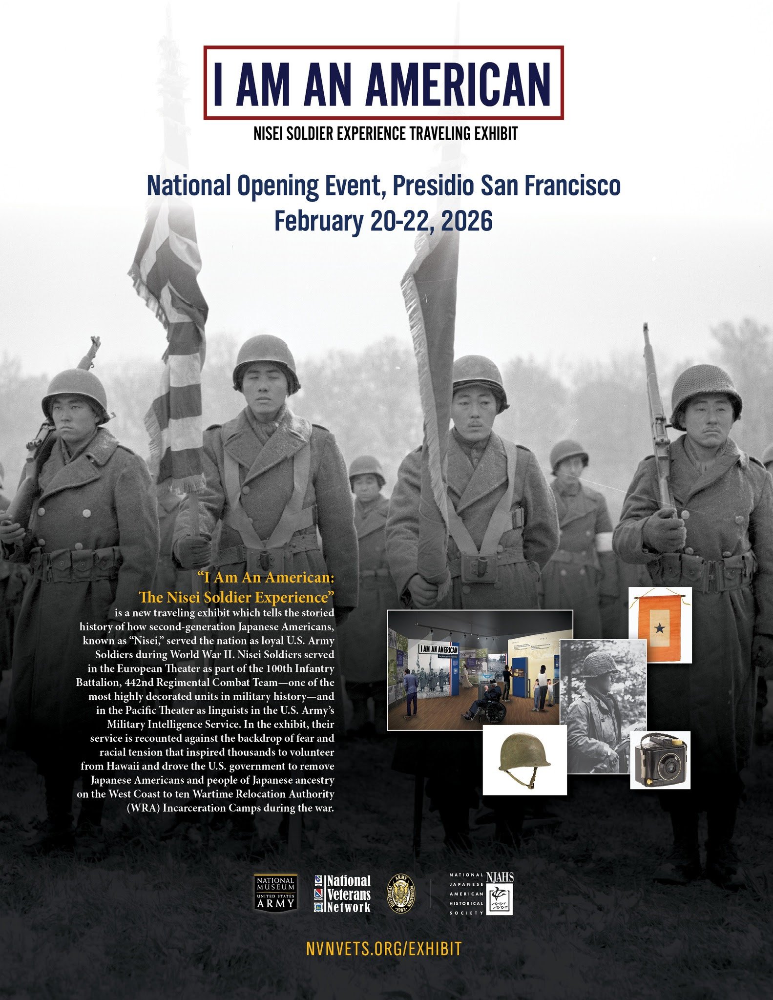 I Am An American - Nisei Soldier Experience Traveling Exhibit Opening in San Francisco February 2026 Friday, February 20, 2026 12:30 AM Sunday, February 22, 2026 11:59 PM Google Calendar ICS Learn more