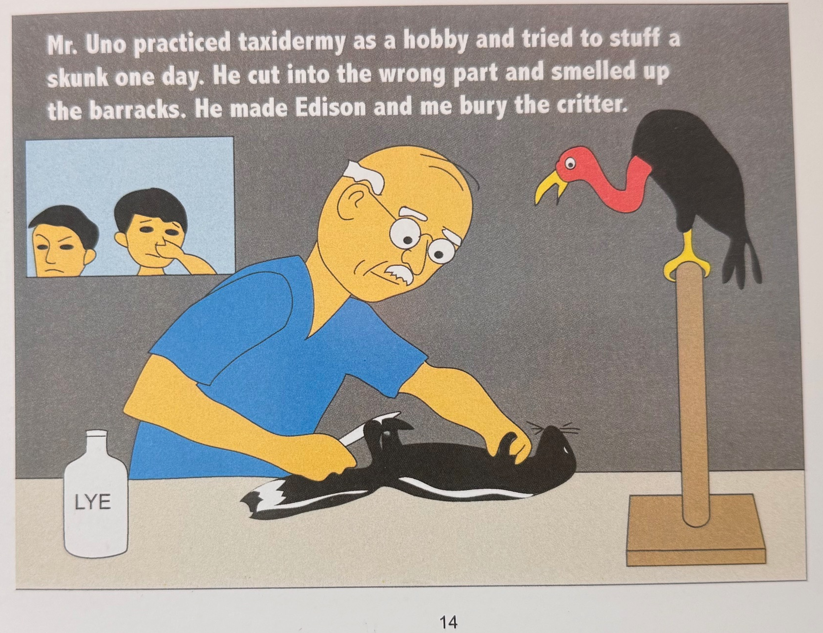 Crystal City was also where George Uno learned taxidermy from a German detainee in the camp, where George Uno was able to build on his knowledge as an entomologist. Victor tells the story that family members laughed remembering granddad's skunk mistake. Notice the mounted buzzard in the drawing? [1] He recounts that ironically “Granddad was arrested under the AEA as a ‘dangerous enemy alien,’ when he was only a danger to the local wildlife. It was funny to hear about him working on a skunk and making his son Edison and the children bury it after he made the barracks smelly.”